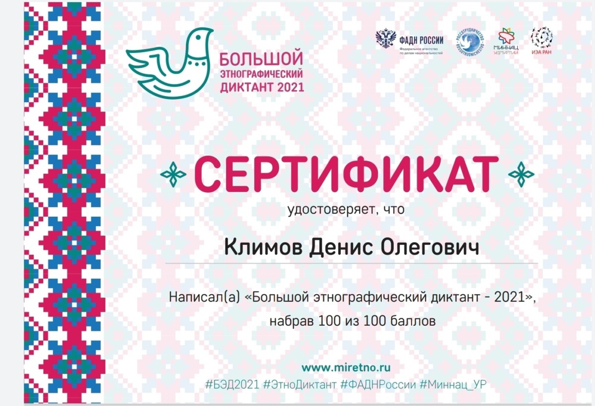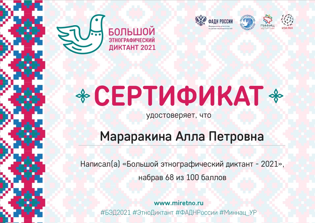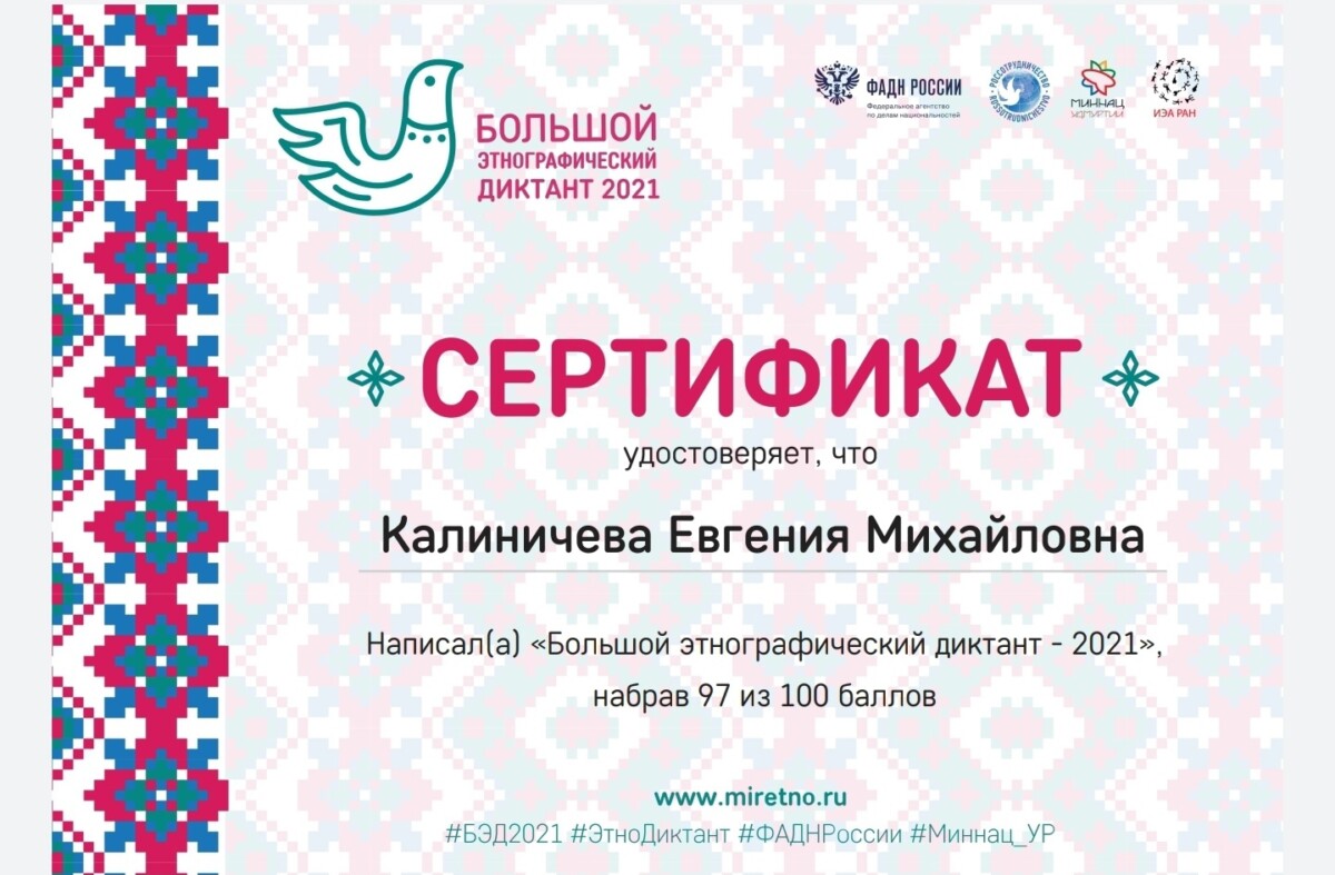 Ежегодная Всероссийская просветительская акция «Большой этнографический диктант», посвященная Дню народного единства, в 2021 году проходит с 3 по 7 ноября в дистанционном формате. Принять участие в ней может любой желающий, пройдя 45-минутный тест на официальном сайте проекта. Этнодиктант включает 30 вопросов об истории, языке, культуре и традициях народов России (из 30 вопросов 10 – уникальные для каждого региона).